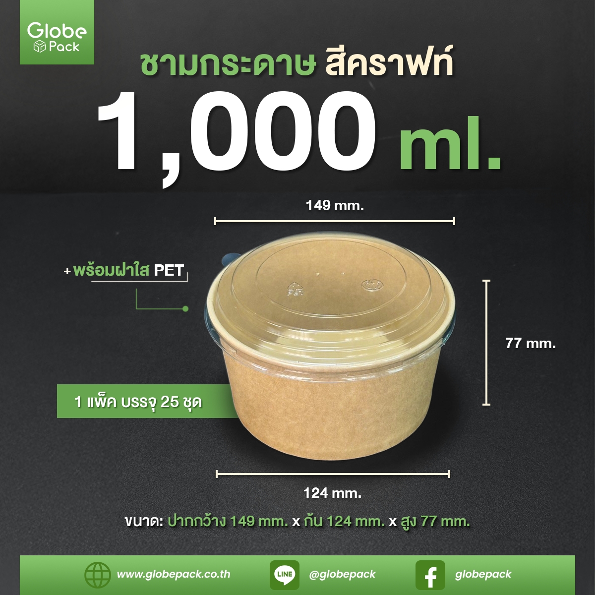 ชามกระดาษสีคราฟท์ 1,000 ml. ทรงเตี้ย + ฝาใส PET ตรา CPW